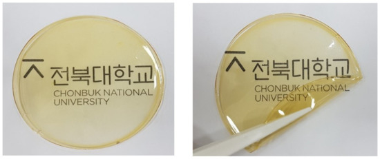 The bromination reaction of PAES was carried out via a free-radical substitution reaction. First, PAES block copolymers (0.8 g) was dissolved in dried 1,1’,2,2’-tetrachloroethane (35 mL) in 100 mL round bottom flaks equipped with mechanical stirrers. The reaction mixture was heated at 60 °C, then NBS and BPO were added. After 6 h, the reaction solution was cooled to RT and recrystallized with ethanol. The obtained solid was washed three times with ethanol and then dried at 60 °C under vacuum. Afterward, Q-PAES was obtained by performing the quaternization reaction of Br-PAES with DABCO. Br-PAES (0.5 g) was dissolved in NMP (5 mL) and then, in addition, DABCO was added to avoid crosslinking. Then, the reaction proceeded for 20 min at 60 °C; the reaction mixture was cast on a glass plate and dried at 70 °C under vacuum until the solvent was evaporated. The remaining DABCO and external substance were removed by immersing the fabricated membrane in methanol at RT for two days. After then the membrane was engulfed in solution of 1 M KOH for hydroxide (OH‒) exchange. The illustration for bromination and quaternization reaction is given in Scheme 2. Corresponding membrane photographs are shown in Figure 1.
