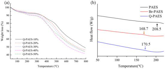 The glass transition temperature (Tg) of PAES, Br-PAES, and Q-PAES was confirmed by DSC analysis (Figure 5b). In the DSC analysis, the temperature was increased at a rate of 10 °C per minute in a nitrogen environment, and the presented DSC curves were obtained from the second scan. The Tg values of PAES, Br-PAES, and Q-PAES polymers were at 208, 168 and 170 °C, respectively. The Q-PAES is exhibited higher Tg value i.e., because of DABCO, which is bulkier than Br, was introduced into the polymer and interferes with the rotation of C–C bond in the main chain.