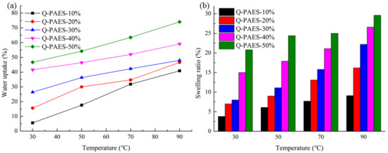(a) Water uptake of fabricated membrane and (b) swelling ratio of Q-PAESs.