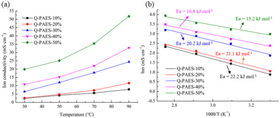 (a) Ion conductivity of Q-PAES membranes and (b) Arrhenius plot of Q-PAES membranes at diversified temperatures with 100% RH.