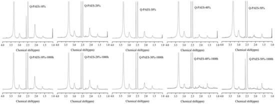 The chemical stability of the AEM plays a significant role in the alkaline operating environment of AFCs. The prepared Q-PAES tested for alkali stability by immersing the membrane in 1 M KOH solution at 60 °C for 1000 h, and the quantity of remaining functional groups was measured by 1H-NMR analysis.