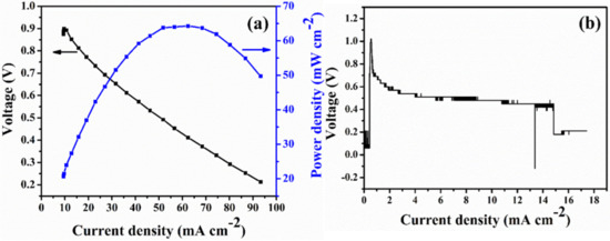 (a) Single fuel cell operation curve and (b) durability plot of Q-PAES-50% quantified at 60 °C and 100% RH. (Catalyst of anode and cathode was Pt/C, 0.3 mg/cm2; humidified hydrogen (100 mL) and oxygen (300 mL) were passed to anode and cathode).