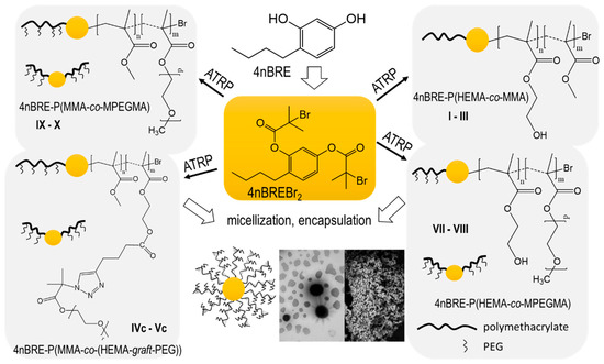 Here we focus on biologically active substances, especially vitamin initiators, which after incorporation into the polymers increase their biocompatibility and transport effectiveness of their encapsulated components. Previously, the vitamins were conjugated with polymers like retinoic acid with heparin [40] or co-loaded with tumor drugs for simultaneous delivery of retinoid acid and paclitaxel [41]. RET has been applied to initiate the ring-opening polymerization of lactide [42] and the controlled radical polymerization of methacrylates [43]. 4nBRE is used as a bifunctional derivative of vitamin A which has a positive effect on skin condition similar to monofunctional RET and has not been investigated as the polymer chain functionalizing moiety. Here we utilize modified 4nBRE, to a dibromoester derivative, for atom transfer radical polymerization (ATRP) to design V-shaped copolymers of methyl methacrylate (MMA), 2-hydroxyethyl methacrylate (HEMA) (P(HEMA–co–MMA)), and MMA or HEMA copolymers with poly(ethylene glycol) methyl ether methacrylate (MPEGMA) (P(MMA–co–MPEGMA) and P(HEMA–co–MPEGMA)). Moreover, another series of grafted copolymers was also obtained by using “click” chemistry reaction as “grafting onto” method. For this purpose, multifunctional copolymers with alkyne functionalized HEMA (AlHEMA) were obtained. Next, the P(AlHEMA–co–MMA)s were subjected to a “click” reaction with azide functionalized poly(ethylene glycol) (PEG-N3). The main structural characteristics of the copolymers were characterized by standard spectroscopy and chromatography methods. The V-shaped copolymers, both linear and graft, were able to self-assemble in aqueous solutions and also demonstrate the ability to encapsulate selected active substances (VitC, VitE, or ARB), these active substances have been shown to have anti-wrinkle and skin brightening properties by using a dialysis method. The micellization behavior of the obtained amphiphilic copolymers was studied using fluorescence spectroscopy, light scattering, and transmission electron microscopy. The release kinetics were monitored by UV transmittance. Additionally, the physicochemical aspect of the drug delivery was compared for two types of PEG graft copolymers, which were prepared by different strategies, one by ‘grafting through’ a macromonomer and the second by side chain ‘click’.