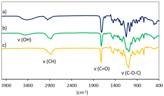 The prepared bifunctional initiator 4nBREBr2 was used in the copolymerization of the different monomers (MMA, HEMA, AlHEMA, MPEGMA), in the presence of a CuBr/dNbpy catalyst system in anisole or anisole/methanol solutions at 60 °C (Table 1). Due to the presence of two bromoester initiating groups, the obtained copolymers are assumed to be V-shaped, as it has been previously reported for polymethacrylates with methyl 4,6-O-benzylidene-α-d-glucopyranoside core [45]. The presence of a bioactive 4nBRE moiety in the center of the polymeric chain can improve its biocompatibility as it has been observed for dextran linking trans-ferulic acid [46]. In comparison to the HEMA/MMA (I-III) and AlHEMA/MMA (IV-VI) linear copolymers, the grafted copolymers were synthesized with the use an MPEGMA macromonomer, which significantly increases the hydrophilicity of the systems (VII-X) due to the PEG side chains [47]. Moreover, the polymerizations carried out with MPEGMA showed high comonomer conversions of above 60% (Table 1). The degree of hydrophilicity was controlled by an appropriate selection of the initial proportions of the MMA or HEMA and MPEGMA comonomers (50/50 and 75/25). The presence of hydroxyl groups in the P(HEMA–co–MMA) and P(HEMA–co–MPEGMA) copolymers is observed in the FT-IR spectra (Figure 3a,b), given as broad peak at 3200–3500 cm−1 in contrast to the copolymer without HEMA units such as P(MMA–co–MPEGMA) (Figure 3c), which is in agreement with analogous polymethacrylates [43,44]. MPEGMA containing copolymers exhibited a high intensity extended band in the range of 1050–1150 cm−1 representing C–O–C stretching vibrations (Figure 3b,c).