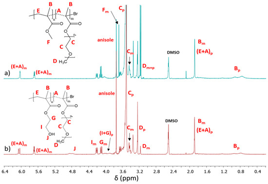 1H NMR spectra of reaction mixture for 4nBREBr2 initiated copolymerization of (a) MMA/MPEGMA: 50/50 (IX) and (b) HEMA/MPEGMA: 50/50 (VII), where signals with indices m and p are related to monomer and polymer, respectively.