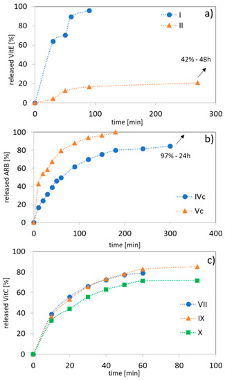 Previously, satisfactory encapsulation of VitC and ARB by linear or graft copolymers functionalized with RET had been observed [43] and this encouraged us to prepare the micellar systems based on the 4nBRE-functionalized copolymers in the presence of VitE, VitC, or ARB. However, the studies showed that in some cases it was not possible to encapsulate and release effectively these substances using synthesized copolymers (Table S1 in Supplementary Materials). In contrast to RET based P(HEMA–co–MMA), the encapsulation of VitC was inefficient by copolymers with 4nBRE as the starting group, both linear (I–III) and the “click” grafted series (IVc, VIc), yielding just a 1% loading. Fortunately, these polymers encapsulated VitE and ARB. An inverse relationship was observed for the graft copolymers with MPEGMA units (VII–X), these demonstrated a good ability to form micelles with encapsulated VitC and VitE (10–50%), but in the latter case, the active substance was not released.