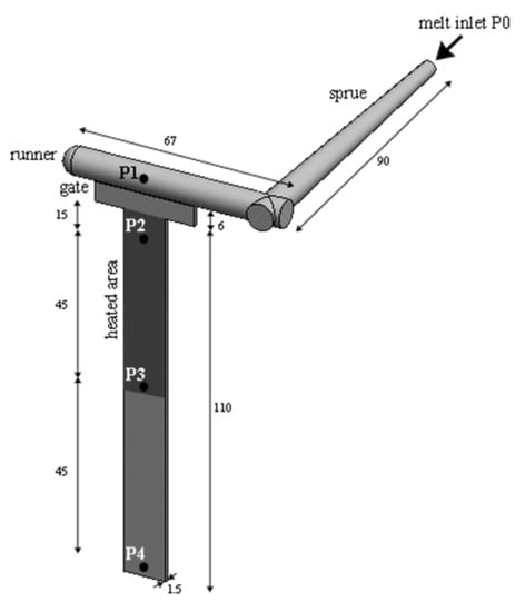 Five pressure transducers (type 6171BB and 6190 BA, Kistler, Milan, Italy) were located along the flow path (namely P0, P1, P2, P3, and P4). In the position P2, a thermocouple (type T, Omega Engineering Ltd, Manchester, UK) was also located for recording the cavity surface temperature evolution. Figure 1 shows the cavity adopted for the injection molding experiments with the position of each pressure transducer along the flow path. The darker area represents the area where the heating device is located.