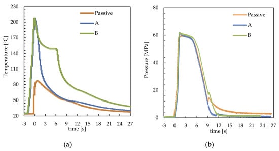 Figure 2a shows the temperature evolutions recorded at 15 mm downstream from the gate (position P2 of Figure 1) with 150 °C cavity surface temperature and two values of the cavity surface heating time, th = 0.7 s and 6 s (A and B). The temperature evolution recorded during the passive test was also reported for comparison. Figure 2b shows the pressure evolutions of the same tests recorded in the same position. In both graphs, the time t = 0 corresponded to the time at which the melt contacted the cavity in position P2.