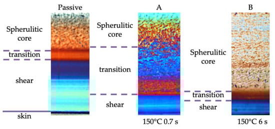 The stretch distribution of the passive sample was characterized by the presence of a maximum in the shear layer; beyond the shear layer, the stretch decreased down to the minimum in the core. The regions characterized by these values of stretch were composed of tightly packed fibrils. In the regions where the stretch decreased, a transitional layer characterized by a continuous transition from the fibrils to the spherulites was found. The formation of these areas was due to weak flows and slower cooling rates with respect to shear layers. The stretch distributions of the samples A and B are also shown in Figure 12. The stretch distribution of samples A and B showed a behavior similar to the one showed by the passive sample, with a maximum of the stretch in the shear layer. However, since the shear layer moved toward the sample surface, the maximum of the stretch was located closer to the sample surface with respect to the maximum of the passive sample. Sample B showed the lowest values of the stretch along the whole thickness according to the increase in the cavity surface temperature and heating time duration. These results confirmed the hypothesis previously introduced that the formation of the transitional areas was due to the weak flow, meaning small values of the stretch and slow cooling rates.