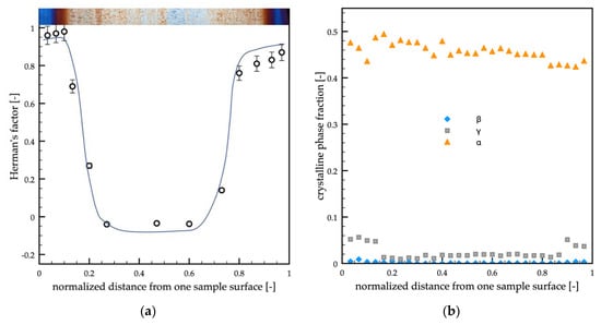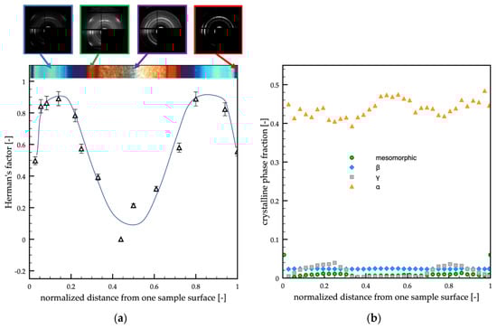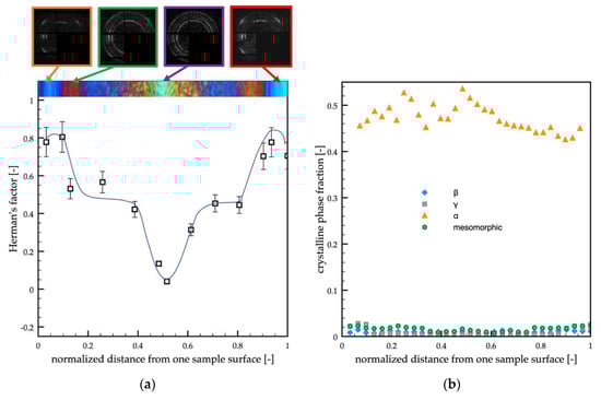 The orientation of sample A was smaller with respect to the passive case. The maxima of orientation were located close to the sample surface, and the minimum was located in the sample core. In the regions between the core and the shear layer, the orientation was found almost constant and slightly lower with respect to the passive case. The distribution of the crystalline phase fractions (Figure 6b) showed again that the α-phase was the predominant one, only a small fraction of γ-phase was present, and it was mainly located close to the sample surface. The mesomorphic and the β-phase fractions were found negligible (smaller than 0.02).