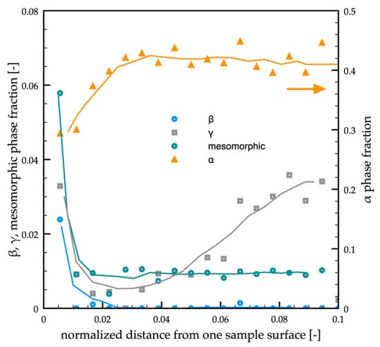 The α-phase fraction increased from 0.30 to 0.45 in the interval 10–100 μm from sample surface (0.005–0.05 normalized distance). The mesomorphic phase fraction reached 0.06 in the first 10 µm from the sample surface, and it decreased down to 0.01 toward the inner parts of the sample (within the first 50 μm).