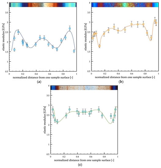 The passive sample showed two maxima of the elastic modulus in the shear regions, the lowest values could be detected at the sample surface and in the transition regions, and the core was characterized by intermediate values of the elastic modulus. The samples A and B showed similar trends of the elastic modulus distribution. Furthermore, they were characterized by higher values of the elastic modulus with respect to the passive sample. The high values of the elastic modulus characteristic of the shear region moved toward the sample surface, accordingly with the reduction of the shear layer thickness due to the increase in the cavity surface temperature.
