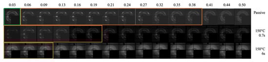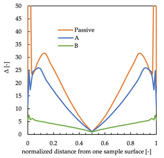 Figure 10 shows the WAXS analyses at different distances from the sample surface for the passive, A, and B cases. The orange borders delimit the regions with a high orientation level.