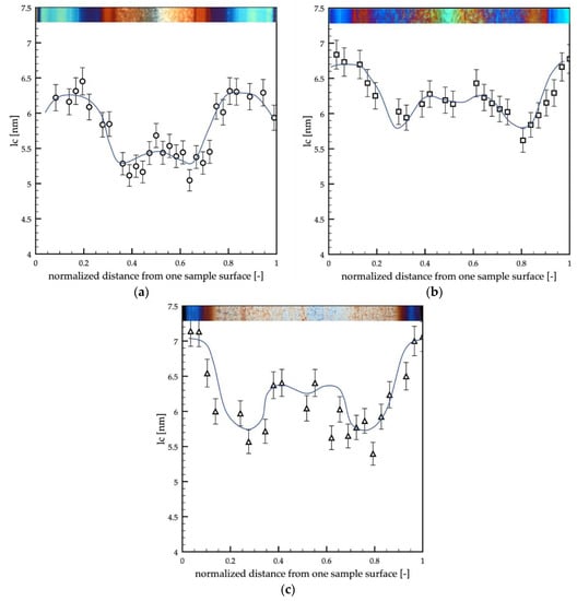 The shear rate at the surface oriented (and stretched) the polymer chains, thus determining an entropy decrease within the system. Consequently, in the shear layer, the material crystallized at higher temperatures, with respect to the quiescent condition, and the formation of thicker lamellae was favored [,,,]. Sample B (obtained with high cavity surface temperature, 150 °C, kept for a long time, 6 s) showed a slight increase in the lamellar thickness, lc, especially in the core region, with respect to the passive and A samples. It seemed that the higher temperature, 150 °C, kept for a long time, 6 s, during the process, enhanced the structuring of the polymer chains, determining the increase of lamellar thicknesses.