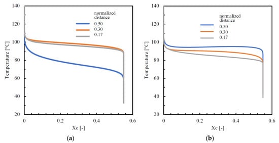 Figure 13a shows that, at the two distances (0.17 and 0.30 normalized distances) from the sample surface, the evolutions of the temperature during crystallization were very close, although the distances from the surfaces were different, this was because: