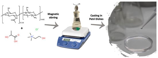 DL-Lactic acid (LA, 2-Hydroxypropionic acid, 80% (w/w), Neva Reaktiv, Saint Petersburg, Russia) was used as received without purification. Choline chloride (ChCl, (2-hydroxyethyl) trimethylammonium chloride) was obtained from AppliChem (≥ 98 wt%, Darmstadt, Germany). The ChCl was dried under vacuum before used. CS (with a Mw = 900,000) was purchased from “Bioprogress CJSC” (Schelkovo, Russia) and used without further purification. The degree of deacetylation, %DA = 68.2% [].