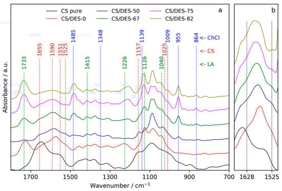FTIR spectra of the pure CS, CS-LA film (CS/DES-0) and films with different NADES contents (50, 67, 75 and 82 wt%) in the regions cm−1 1800–700 (a) and 1680–1500 cm−1 (b).
