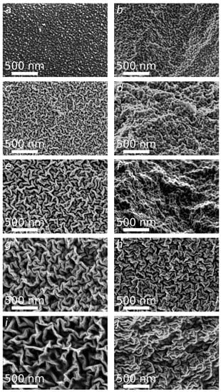 In order to get more insights into the films structure depending on the NADES content, SEM micrographs of the surface and the cross sections were acquired (Figure 3). The surface of the reference CS film (CS/DES-0) shows high uniformity, smoothness, and grain-like morphology (Figure 3a,b). The incorporation of DES leads to the formation of rough surface. The random orientation of a hierarchical wrinkle structure is observed (Figure 3c,e,g,i). The increase of NADES content from 50 wt% to 82 wt% leads to the gradual increase of wrinkles’ size from about 40 nm to 100 nm in diameter and appearance of free space between the wrinkles. At low NADES content (50, 67%), the wrinkled structure of cross-sections is less pronounced (Figure 3d,f) in comparison with the surface (Figure 3c,e). For the samples with higher NADES content this is not the case: the morphology of cross-sections and surfaces is similar (Figure 3g–j). However, the folds have a slightly more compact structure in terms of volume (Figure 3h,j).
