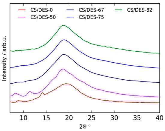 The crystalline structure of the samples was investigated with WAXD. The patterns are demonstrated in Figure 4. Values of interplanar distances (d) were calculated from the Bragg angles (2θ) of the reflections according to Bragg equation 2dSinθ = nλ, where λ is an X-ray radiation wavelength, n is an integer. The WAXD pattern of CS/DES-0 film prepared without ChCl demonstrated reflections at 2θ = 9.2° (9.65 Å), 14.4° (6.19 Å) and 19.6° (4.59 Å). These peaks are typical for CS crystal structure in an anhydrous polymorph [,,,,]. It has been considered that in the case of monocarboxylic acids the spontaneous water-removing from their chitosan salt occurs []. This is also in agreement with water sorption measurements, presented in Section 3.5., which demonstrate that the CS/DES-0 film has a lower water sorption ability than any sample containing NADES. The incorporation of 50 wt% NADES resulted in the change of peaks positions to 2θ = 8.42° (10.52 Å), 11.33° (7.84 Å) and 18.85° (4.77 Å) revealing that the introduction of 50 wt% NADES caused an emergence of hydrated polymorph of CS [,,,]. A further increase in the NADES content up to 67 wt% leads to the separation of CS chains due to the formation of NADES inside a film and to amorphization of the samples. The above results well correspond with FTIR data (see Section 3.1.), which demonstrates that 50 wt% NADES is not enough to form NADES inside the film due to the interaction of CS with LA to form the CS salt.