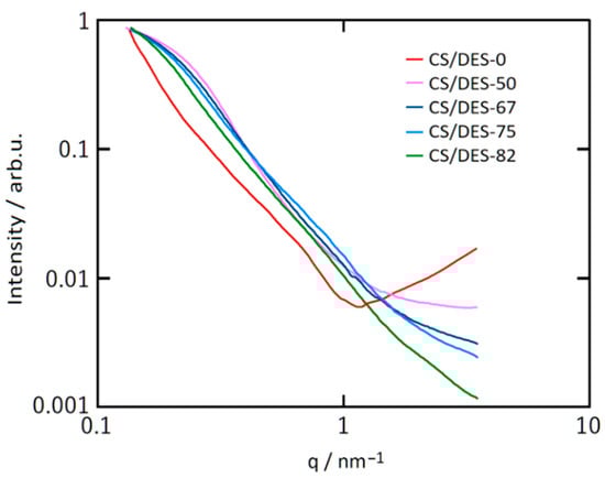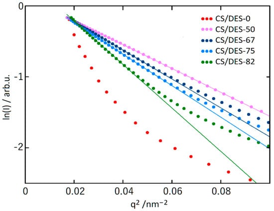 The addition of ChCl, leads to appearing of a hump at low scattering angles for the sample CS/DES-50, that is not observed for CS/DES-0. This hump shifts toward lower q values with increasing DES content. Such a behaviour of the intensity indicates the appearance of inhomogeneities of electron density, the average size of which increases with increasing of NADES content. Moreover, the scattering intensity at high q values decreases with increasing of NADES content, which can be attributed to a decrease in the relative fraction of small inhomogeneities. The size of inhomogeneities (Rg) can be estimated from the slope of the initial portion of scattering curves plotted in Guinier coordinates (ln(I) vs q2) [], which are presented in Figure 6. The following equation is used for this purpose:
