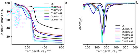 TGA (a) and DTG (b) curves for CS, CS-LA film (CS/DES-0) and films with different NADES contents (50, 67, 75 and 82 wt%).