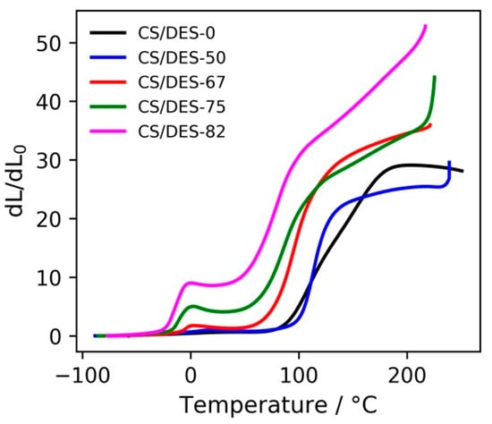 TMA curves (Figure 8) of all of the CS/DES samples are quite similar to those for amorphous polymers and have several regions. The first one (from starting temperature up to about Tg values, Tg varies from −23 to −5 °C as the NADES content decreases) corresponds to the glass state of the CS, small deformations at moderate stresses applied being observed. This assertion is based on the DSC data obtained in [] for CS/DES system, which revealed a substantial decrease in Tg of the CS (Tg ~165 °C) upon mixing with the NADES. Noteworthy is that along with the decrease in Tg of the polymer an augment of the film deformation was observed as the NADES content was increased. Obviously, NADES have a plasticizing effect, their molecules being distributed between CS molecules and hindering the inter- and intramolecular interactions between the polymer chains due to formation of strong hydrogen bonds with CS []. As a result, the mobility of the macromolecular chains increases. This leads to Tg reduction, Tg depending on the concentration of the introduced plasticizer.