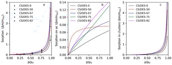 The experimental results of water sorption at different RH for CS film prepared with LA without ChCl and with addition of different amounts of NADES are shown in Figure 9a with circle markers. The curves in this plot demonstrate the Laatikainen–Lindström isotherms with parameters fitted according to Equation (1): the values of found parameters are listed in Table 3. It is seen that the amount of active sorption sites increases gradually with increasing of content of ChCl. This means that ChCl gives significant impact to the sorption of water on primary sorption centers in the CS/DES films. At the same time the activity of primary sorption centers toward binding of water is maximal for CS/DES-50 film and decreases either on the elimination of ChCl or on the decreasing of CS content. It can be proposed that in comparison with the CS/DES-0 sample, the CS/DES-50 film contains a lower amount of the LA, which is partly incorporated in the interaction with ChCl. As a result, a high amount of free -OH and -NH2 groups can be expected. These groups can act as primary sorption centers with high activity as was demonstrated earlier []. The increase of the NADES content leads to the decreasing of α value, which is illustrated as decreasing of curvature of the curves of sorption on active centers, given in Figure 9b. This reflects changes in the nature of primary sorption centers because of decreasing of CS content and increasing of ChCl content.