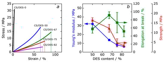 Typical view of stress-strain curves for the reference CS film (CS/DES-0) and composites with different NADES contents (a). Dependences of mechanical properties of the films on the NADES content (b).