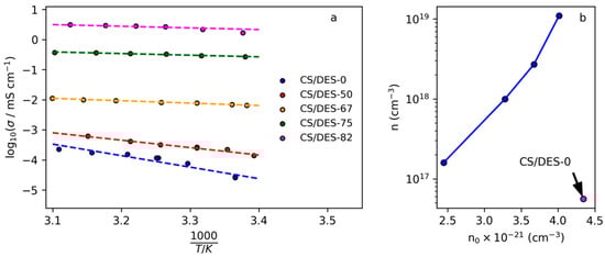 (a) Dependences of logarithm of electrical conductivity on the reciprocal temperature for the film CS with LA and CS films prepared with different NADES content (a) and (b) dependence of the number density of charge carriers (n) on the number density of -COOH groups (n0) in the films.
