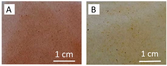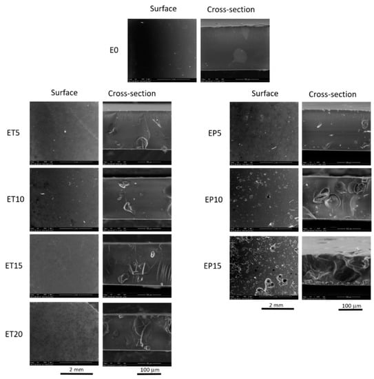 Membranes ET5–ET20 were prepared with 5, 10, 15 or 20 wt % of TP, while membranes EP5, EP10, EP15 were obtained from Ebecryl 150 resin loaded with 5, 10 and 15 wt % of TGP, respectively. Membrane E0 was fabricated without a filler. Unfortunately, due to characteristic of propolis [29], which contain high amount of wax, films containing propolis weight percentage higher than 15 exhibited very poor mechanical properties and were not suitable for further analysis. Optical microscope studies put into evidence that in all cases both fillers are homogenously distributed in the membrane structures. As a matter of example, Figure 2 presents photos of ET10 and EP10 film surfaces captured by an optical microscope.
