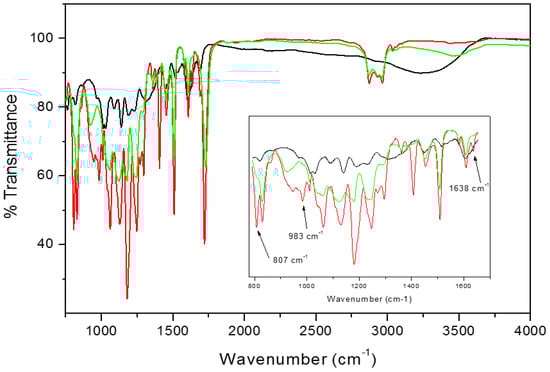 FTIR spectra of Taiwanese green propolis (TGP) powder (black line), EP10 before UV-curing (red line) and EP10 UV cured (green line). In the inset, the 790–1650 cm–1 region is zoomed.
