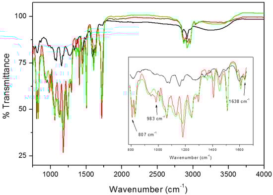 FTIR spectra of tea powder (black line), ET10 before UV-curing (red line) and ET10 UV-cured (green line). In the inset, the 790–1650 cm−1 region is zoomed.