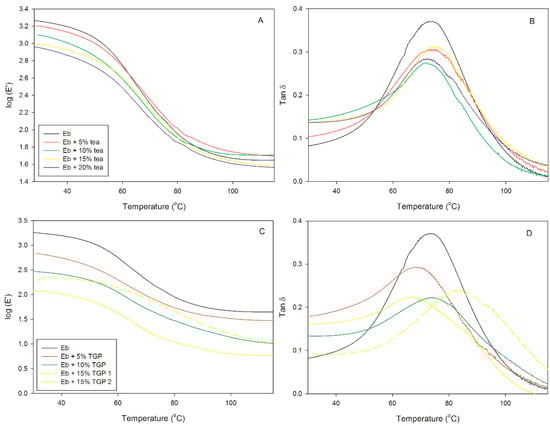 (A) Storage modulus and (B) tan δ (loss tangent = E”/E’) of tea films and (C) the storage modulus and (D) tan δ (loss tangent = E”/E’) of TGP films.