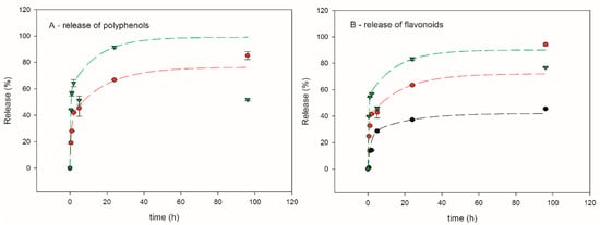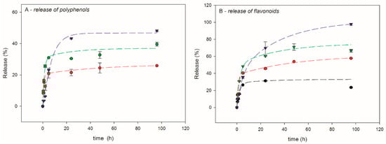 Figure 8 reports the release kinetics of polyphenols and flavonoids in the mixture EtOH–H2O (7:3 v/v) for EP samples.