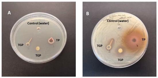 Inhibitory activity of TP and TGP extracts against S. epidermidis. (A) time 0; (B) after 24 h incubation.