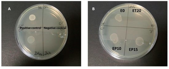 Antibacterial activity against S. epidermidis after 24 h incubation. (A) Positive control (liquid medium + S. epidermidis) and negative control (liquid medium without bacteria); (B) E0, ET20, EP10 and EP15 membranes.