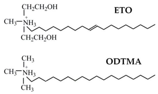 Polylactide (PLA) (3051D) with a D-isomer content of 3.7%–4.6%, a residual monomer content less than 0.3 wt %, a number-average molecular weight of 70,000 g/mol and a polydispersity index of 1.67, as measured by gel permeation chromatography (GPC), was supplied by Nature Works LLC (Minneapolis, MN, USA). PLA pellets were vacuum dried for 2 days at 60 °C and kept in desiccation before use. Expanded vermiculite (VMT) was purchased from Sigma-Aldrich (Munich, Germany) with grade number 3, and was ground to obtain particles less than 40 μm in size. The surfactants used, oleyl bis(2-hydroxyethyl) methyl ammonium chloride (ETO) (Figure 1) supplied by Akzo Nobel (Stenungsund, Sweden), and octadecyl trimethylammonium bromide (ODTMA) (Figure 1) supplied by Aldrich (Munich, Germany), were used as received.