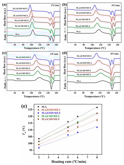 DSC thermograms of neat polylactide (PLA) and PLA/VMT nanocomposites obtained at heating rates (a) 2 °C/min, (b) 5 °C/min, (c) 6 °C/min, and (d) 8 °C/min. (e) Cold crystallization temperature as a function of the heating rate for PLA and PLA/VMTs.
