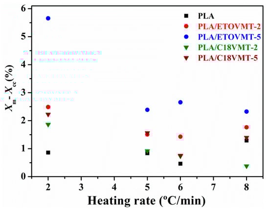 The actual crystallinity of PLA and its nanocomposites, calculated as the difference between Xm and Xc, as a function of heating rate is presented in Figure 5. The Xm–Xc values of PLA decrease as the heating rate increases, at low heating rates the molten PLA has more time to reorganize itself into new crystals. The presence of organomodified VMTs has only a small effect on Xm–Xc values of PLA. The incorporation of 5 wt % of ETOVMT leads to a slightly higher value of Xm–Xc compared with that of neat PLA at all heating rates, most notably at a low heating rate (2 °C/min). DSC analysis data reported by Ublekov et al. [34] showed that the crystallinity of PLLA/Cloisite 30B composites increased drastically at high clay loadings (5–9 wt %).