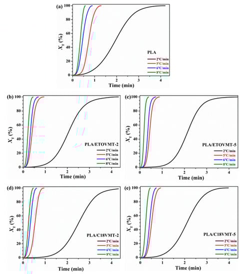 Relative crystallinity as a function of time at different heating rates for the cold crystallization of (a) PLA, (b) PLA/ETOVMT-2, (c) PLA/ETOVMT-5, (d) PLA/C18VMT-2, (e) PLA/C18VMT-5.