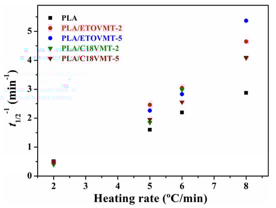 The crystallization half-time (t1/2), the time required to achieve 50% of the final crystallinity of the samples, can be calculated directly from the plots of relative crystallinity versus crystallization time (Figure 6). Such value is very important to discuss the non-isothermal cold crystallization rate of neat PLA and its nanocomposites. The inverse value of t1/2 (i.e., 1/t1/2) signifies the bulk crystallization rate, and a lower 1/t1/2 value indicates slower crystallization. The 1/t1/2 value depends on the cooling rate, and as expected it decreases with increasing heating rate for both PLA and PLA/organo-VMT nanocomposites (Figure 7), indicating that higher heating rate corresponds to faster crystallization process. The 1/t1/2 values in the nanocomposites are higher than that of neat PLA at the heating rates higher than 2 °C/min, indicating that the nanoclay could accelerate the overall crystallization process of PLA. However, at 2 °C/min heating rate the values of 1/t1/2 for PLA/organo-VMT composites are similar to that of neat PLA, suggesting that at this heating rate the addition of organoclay does not affect the rate of crystallization. The maximum difference between the 1/t1/2 value of pure PLA and PLA/VMT nanocomposites is observed at the highest heating rate (i.e., 8 °C/min). The PLA/ETOVMT nanocomposites exhibit the highest value of the reciprocal of t1/2, indicating that the crystallization processes of PLA/ETOVMT nanocomposites are finished in shorter times than that of pure PLA, since the rate of the crystallization of PLA is faster in the presence of ETOVMT due to its nucleating effect.
