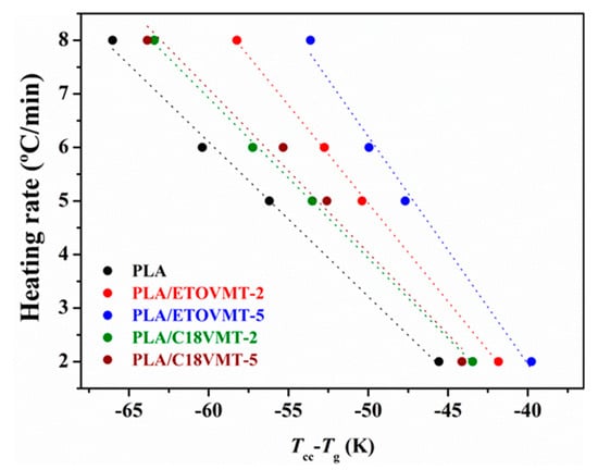Cold crystallinity values, Xcc, are presented in Table 2 and Figure S2. The Xcc value of neat PLA decreases almost linearly with the heating rate. However, for PLA/VMT nanocomposites, a decrease in the Xcc value is observed at 5 °C/min, and it is almost independent of the heating rate in the range of 5 to 8 °C/min. The incorporation of 5 wt % ETOVMT and C18VMT to PLA results in a noticeable decrease in the cold crystallinity value at heating rates lower than 8 °C/min, whereas an increase is observed compared to that of neat PLA at 8 °C/min for all nanocomposites, especially those containing 2 wt % organoclays. Similar variation trends concerning Tcc, ∆Hcc, and Xcc have been reported in the literature by Wu et al. [33] and Picard et al. [38] in their studies of non-isothermal cold crystallization of PLA/OMMT nanocomposites. Therefore, it can be concluded that VMTs promote the non-isothermal cold crystallization of PLA at high heating rates, and that the degree of dispersion in the polymer matrix and the clay content are significant factors in the different crystallization behavior of PLA.