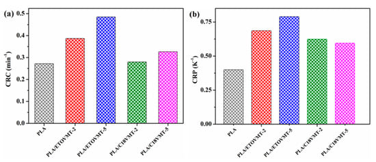 (a) Crystallization rate coefficient (CRC) and (b) crystallization rate parameter (CRP) values of PLA and PLA/VMT nanocomposites.