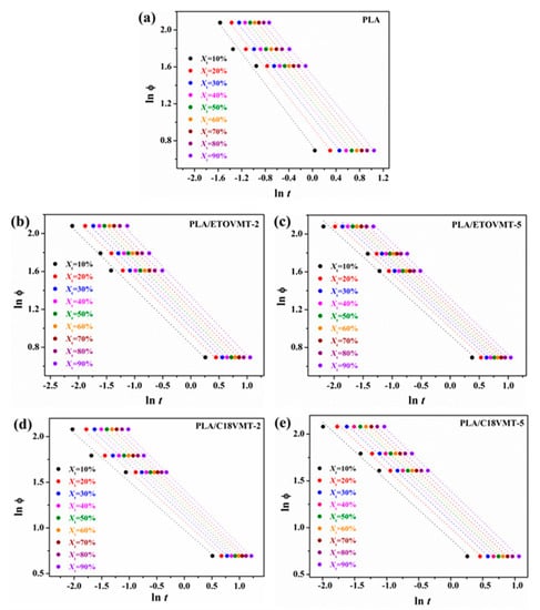 Plots of ln ϕ vs. ln t for the non-isothermal cold crystallization of (a) PLA, (b) PLA/ETOVMT-2, (c) PLA/ETOVMT-5, (d) PLA/C18VMT-2, (e) PLA/C18VMT-5.