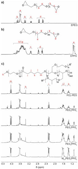 Proton nuclear magnetic resonance (1H NMR) spectroscopy was conducted on a Bruker Avance II 300 MHz spectrometer (Billerica, MA, USA), using the solvent signal as an internal reference. The composition of the copolymers was calculated using the ratios of the integral values of characteristic resonances at δH 4.0 (methylene group of PCL repeat unit), 3.6 (methylene group of PEG repeat unit), 1.1 (methyl group of PPG repeat unit) and 2.8 (methine group of epoxide end-groups) ppm.