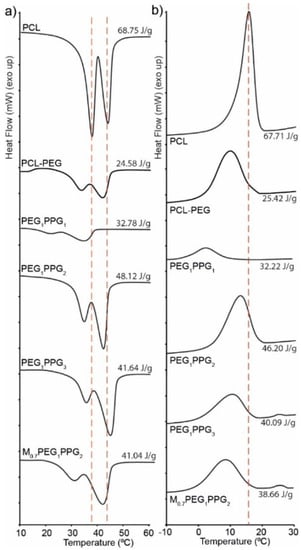 35]. The observed differences indicate that the incorporation of PEG and PPG branches into the copolymers interferes with the crystal packing of the PCL segments, resulting in smaller crystallites. This is also supported by the exothermic crystallisation transition (