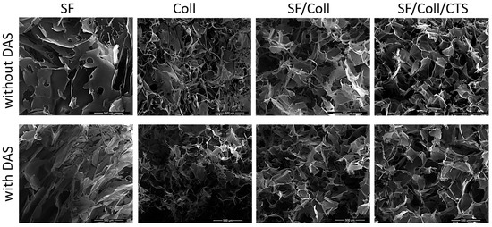 Decrease in material porosity upon cross-linking with DAS was accompanied by an increase in sample density in all samples, except Coll, in which density, like porosity, was not affected by the presence of DAS. The most pronounced differences in both porosity and density were observed for SF, which may indicate strong affinity of DAS to SF. The concentration of SF in SF/Coll and SF/Coll/CTS mixtures was lower, thus the influence of DAS was less distinct. Increasing density of material would favour cell growth and proliferation, as more materials can be accessed by the cells [50,51]. Increased matrix density enhances proliferation due to an increase in matrix stiffness [50]. Increase in matrix stiffness accompanies increased density [51].