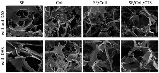 The morphology of the scaffolds was evaluated with scanning electron microscopy (Figure 1 and Figure 2). Each scaffold had a porous structure with interconnected pores. Pores with a diameter of ca. 200 μm or smaller were present. The size of the pores was determined based on SEM images [45,46]. The pores had similar sizes to pores in scaffolds made of chitosan, collagen and hyaluronic acid [43]. Such a material microstructure is necessary for the tissue engineering purposes [44]. According to Hulbert et al., the minimum pore size required to bone tissue regeneration is generally considered to be ~100 μm [52]. However, larger pores of 100–200 μm showed substantial bone ingrowth as well. Smaller pores (75–100 μm) resulted in ingrowth of unmineralized osteoid tissue, and the smallest pores (10–75 μm) were penetrated only by fibrous tissue [52]. These results were correlated with normal Haversian systems that reach an approximate diameter of 100–200 μm [52]. The larger pore size allows a greater number of blood vessels to grow [45]. The minimum recommended pore size for scaffolds is 100 μm according to the early work of Hulbert et al. [52], but subsequent studies have shown better osteogenesis for implants with pores that are >300 μm [53,54,55]. For materials made of silk fibroin, bigger pores can be observed than in materials made of collagen. It has been shown by other research groups that, for silk fibroin and collagen mixture scaffold, the changes in structure and morphology in comparison with scaffolds made of one biopolymer can be observed [56]. The results of our previous paper [39] and this research on SF/Coll and SF/Coll/DAS are consistent with the previous paper regarding the SF/Coll blend. The microstructure of ternary mixture material was more uniform, and more regular pores were observed. After the addition of a cross-linking agent, the largest changes were observed for SF/Coll and SF/Coll/DAS. The microstructure of modified scaffold is more organized comparing with non-crosslinked sponges (especially for collagen scaffold) as in our previous research [39]. The addition of dialdehyde starch improves the organization of sponges as has been shown by Kaczmarek et al. [57] for when the sponges were made of gelatin and chitosan with 5% addition of DAS. However, significant changes were not observed for scaffolds based on binary and ternary mixtures, likewise, in our earlier research, when chitosan and collagen were mixed with sodium alginate [58] and when collagen, chitosan and hyaluronic acid were mixed together to form ternary blend [59,60].