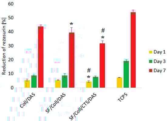 Metabolic activity reflected by reduction of resazurin on days 1, 3, 7 of MG-63 cells cultured on Coll/DAS, SF/Coll/DAS and SF/Coll/CTS/DAS scaffolds and on control TCPS. Mean ± standard error of the mean (* p < ± 0.05 vs. Coll/DAS; # p < ± 0.05 vs. SF/Coll/DAS according to one-way ANOVA with Holm–Sidak post hoc test).