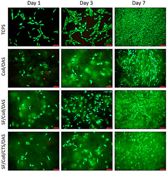 Images of MG-63 cells grown for 1, 3 or 7 days on Coll/DAS, SF/Coll/DAS and SF/Coll/CTS/DAS scaffolds and on control TCPS. Live/dead staining. Scale bar = 100 μm.